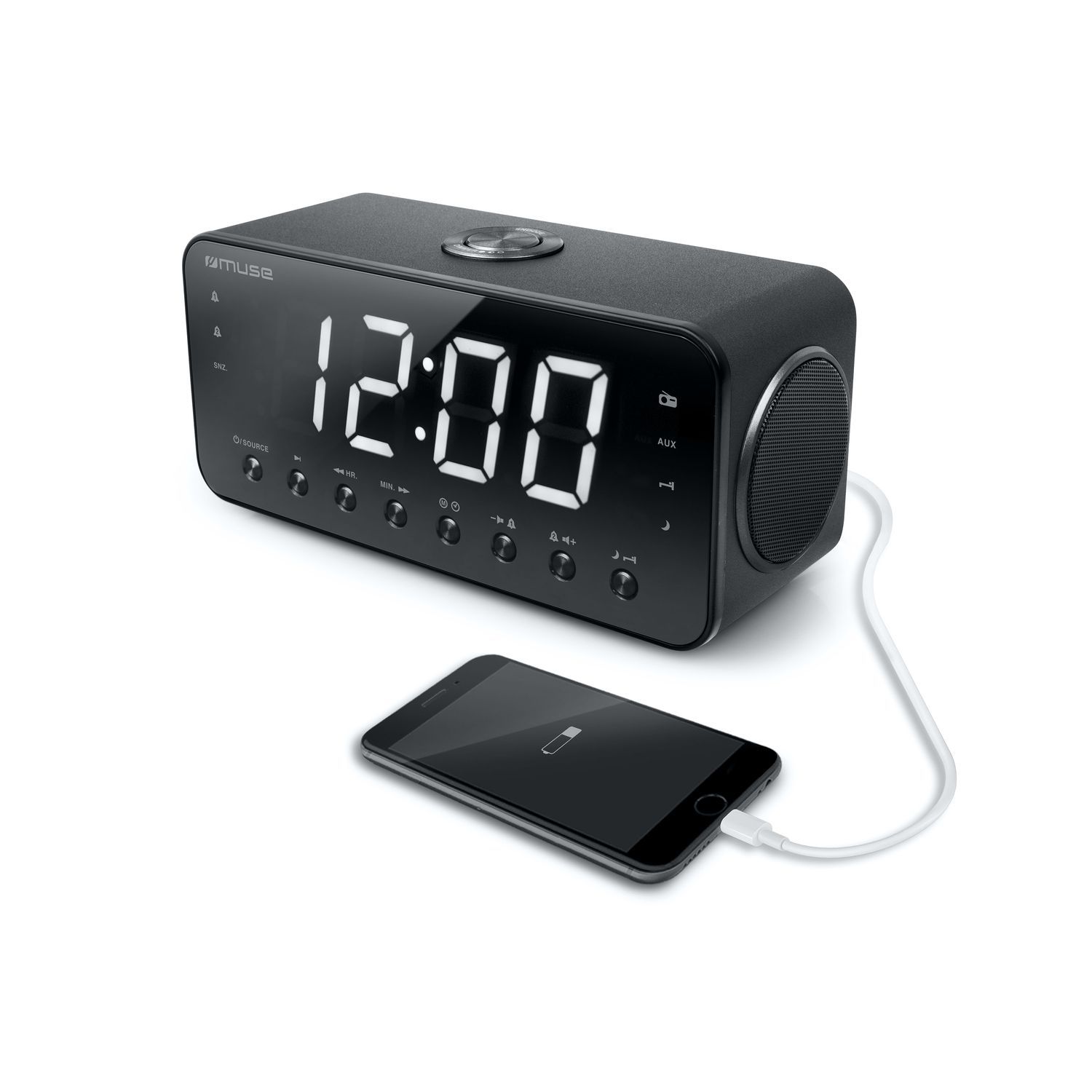 Radio FM - Double alarme - Port USB de chargement - Fonctionne sur secteur avec piles de sauvegarde
