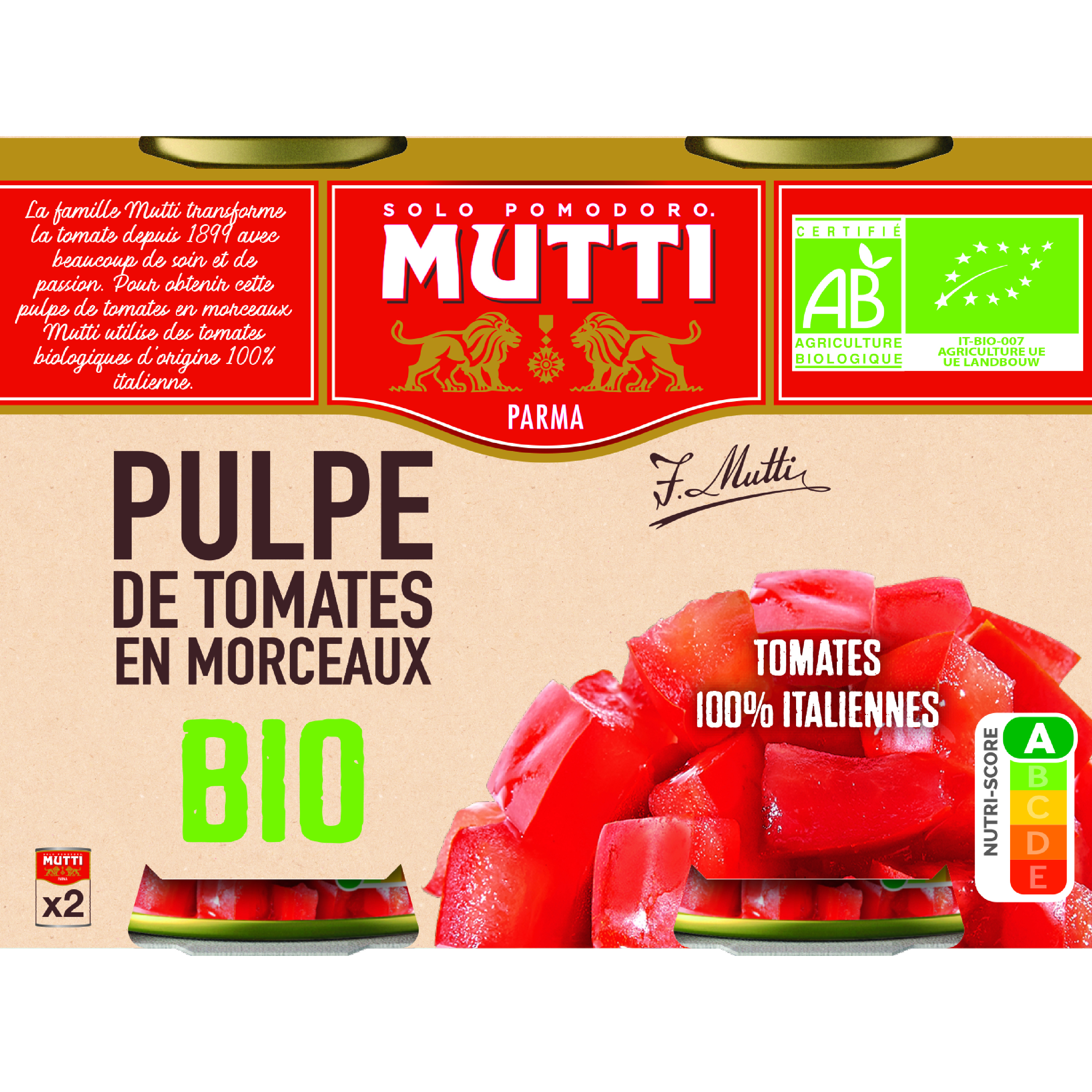Produit culte en Italie, la pulpe de tomates en morceaux Bio MUTTI est obtenue à partir du cœur de tomates issues de l'agriculture biologique, pelées puis découpées en cubes et conservées dans leur jus. Particulièrement fraîche, c’est une excellente base pour toutes vos préparations, et ce, tout au long de l’année : elle brille sur une bruschetta, relève vos pâtes, est parfaite comme base de pizza et agrémente avec brio les plats de légumes.