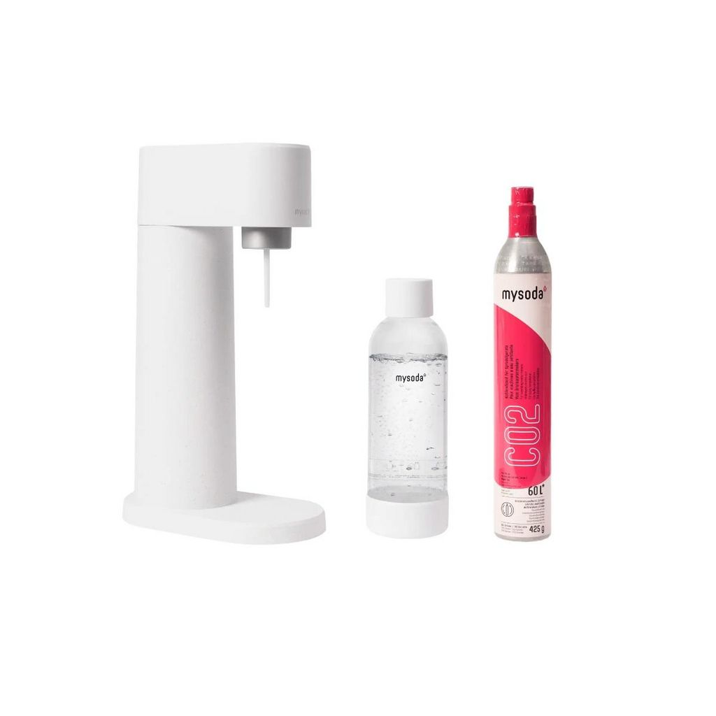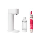 Pack prêt à l'emploi comprenant 1 machine à gazéifier, 1 cylindre de CO2 rechargeable (permettant de réaliser jusqu'à 60 L d'eau pétillante) et 1 bouteille de gazéification d'une capacité de 1 L en plastique PET et biocomposite.