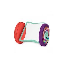 Un miroir coloré qui reste bien droit lorsqu'on le pousse. Deux grosses roues font que le miroir roule sur le plancher pour permettre aux plus petits de faire la course pour l'attraper. Une roue fait résonner des petites billes, tandis que l'autre fascine avec une spirale impressionnante. 0 à 2 ans