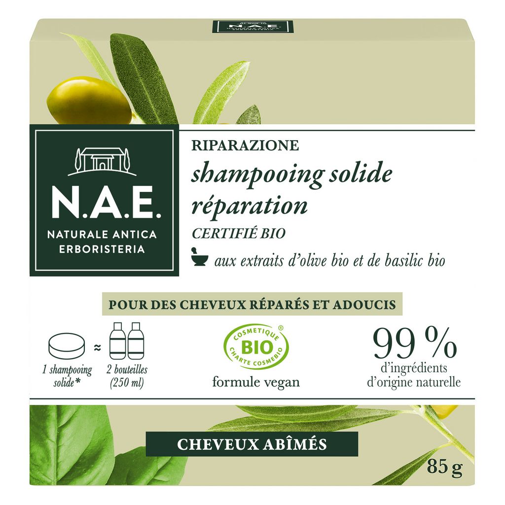 Shampooing solide bio réparation extraits d'olive et basilic cheveux abîmés