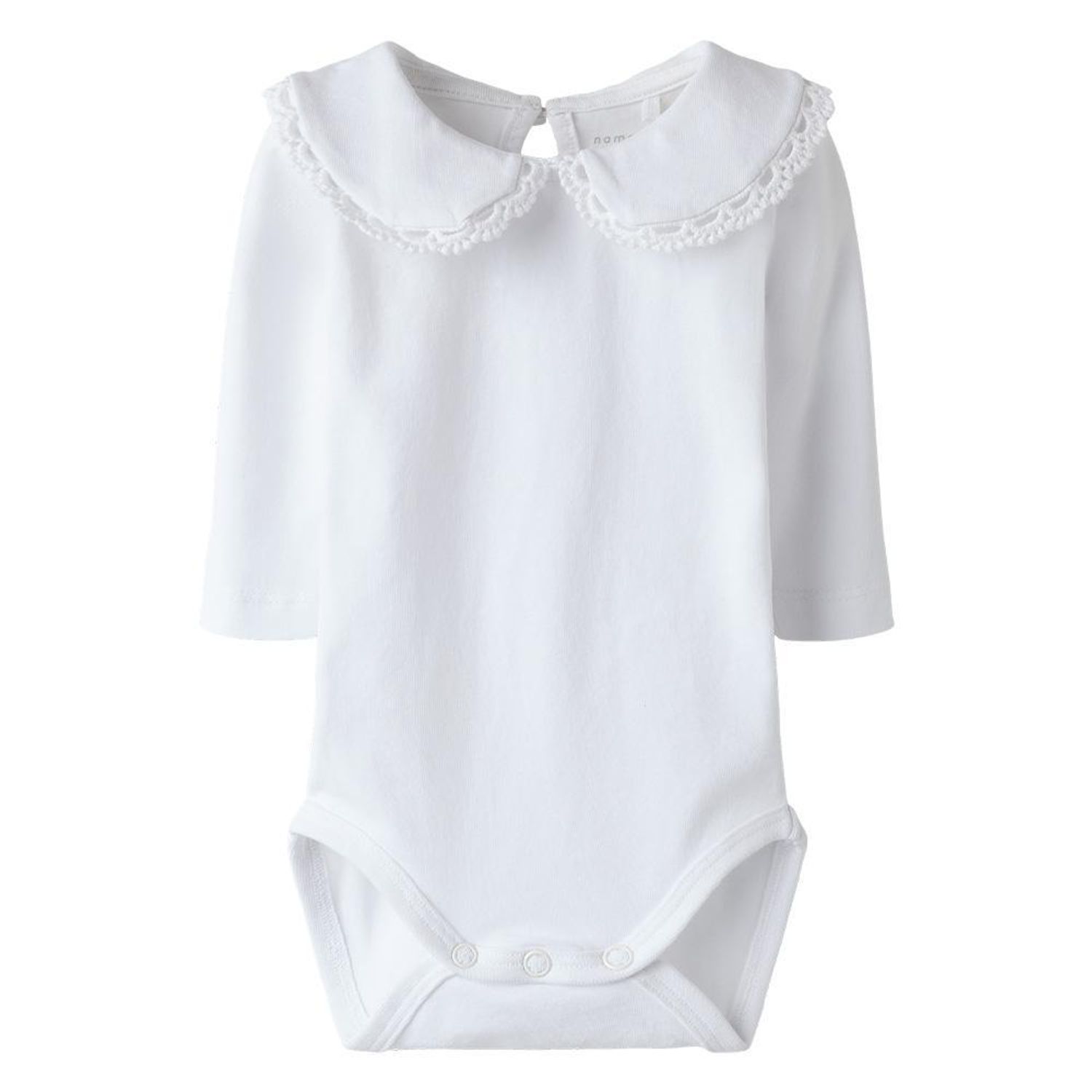 Optez pour ce body Name it à prix bas !- Coloris : Blanc- Col rond- Manches longues- Composition : 95% Coton biologique, 5% Élasthanne