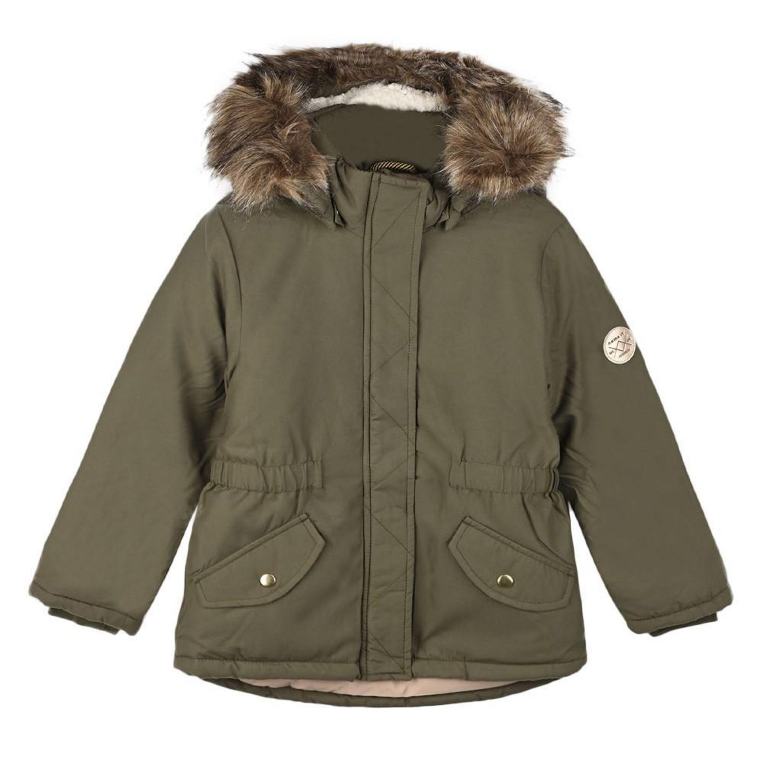 Adoptez la parka fille de la marque Name It Coloris : Kaki Fermeture zippée avec patte de boutonnage Manches longues Faussure fourrure amovible Capuche amovible Badge, décoratifs réfléchissants Plus long à l'arrière Rembourrage en polyester pour la chaleur Poches avant avec fermeture par bouton-p