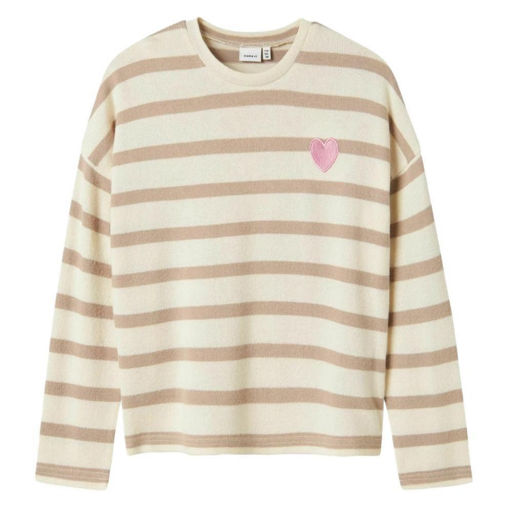 Optez pour le pull fille Name it !Manches longuesCol rondRayuresLogo coeur brodéComposition : 84% viscose , 14% polyester , 2% élasthanne