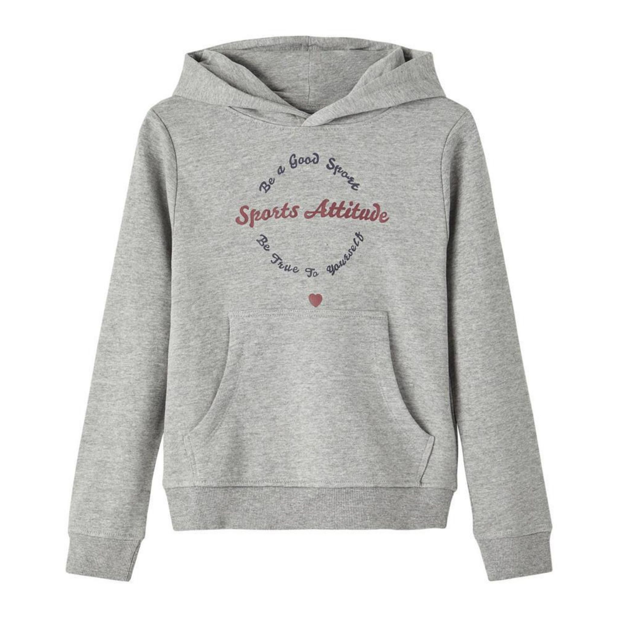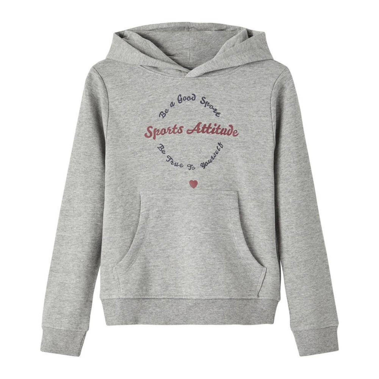 Sweat pour fille de la marque Name It Manches longues Capuche 1 poche kangourou Coloris : Gris Inscription sur l'avant Composition : 60% coton , 40% polyester