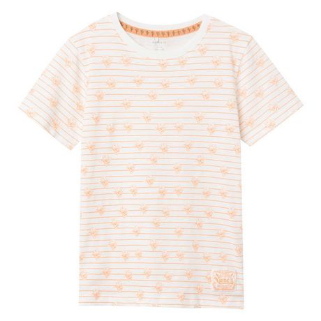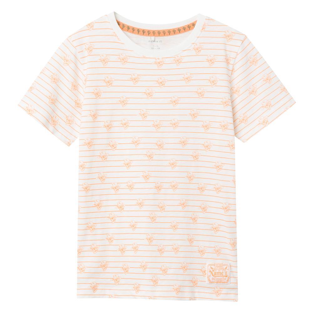 T-shirt garçon de la marque Name It !Manches courtesCol rondColoris : Blanc/OrangeImprimé rayures et tête de mortComposition : 95% coton , 5% élasthanne