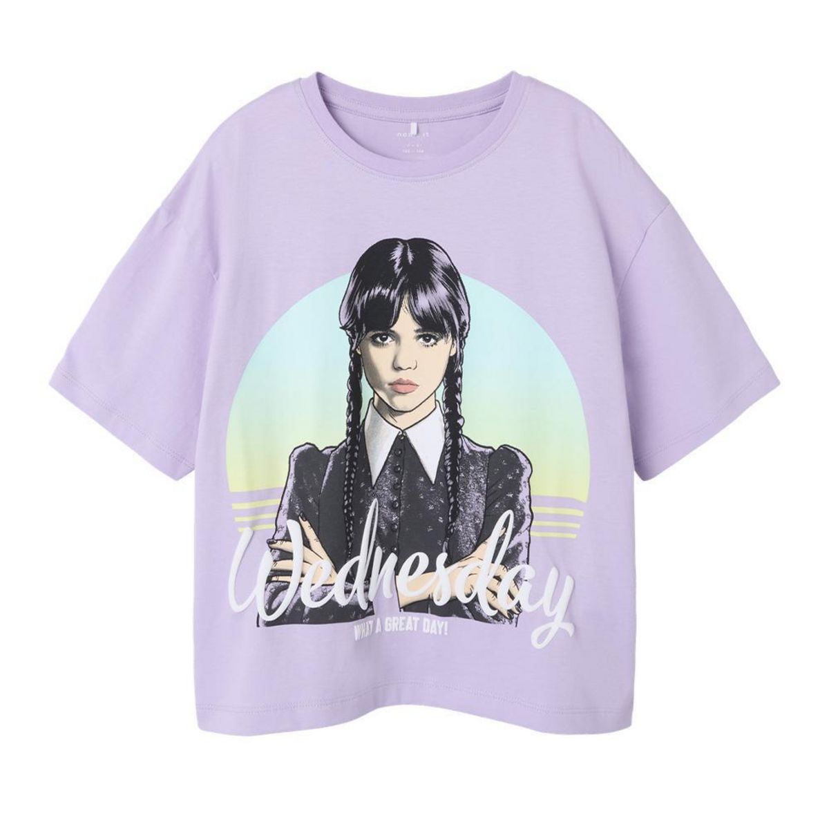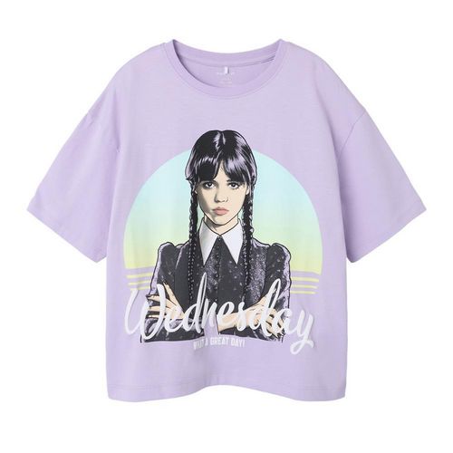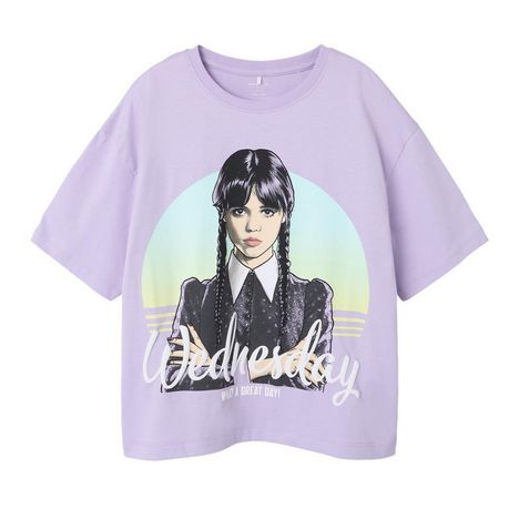 Optez pour le t-shirt d la série Mercredi à prix bas ! Coloris : Violet Col rond Manches courtes Imprimé sur la poitrine Composition : 100% Coton