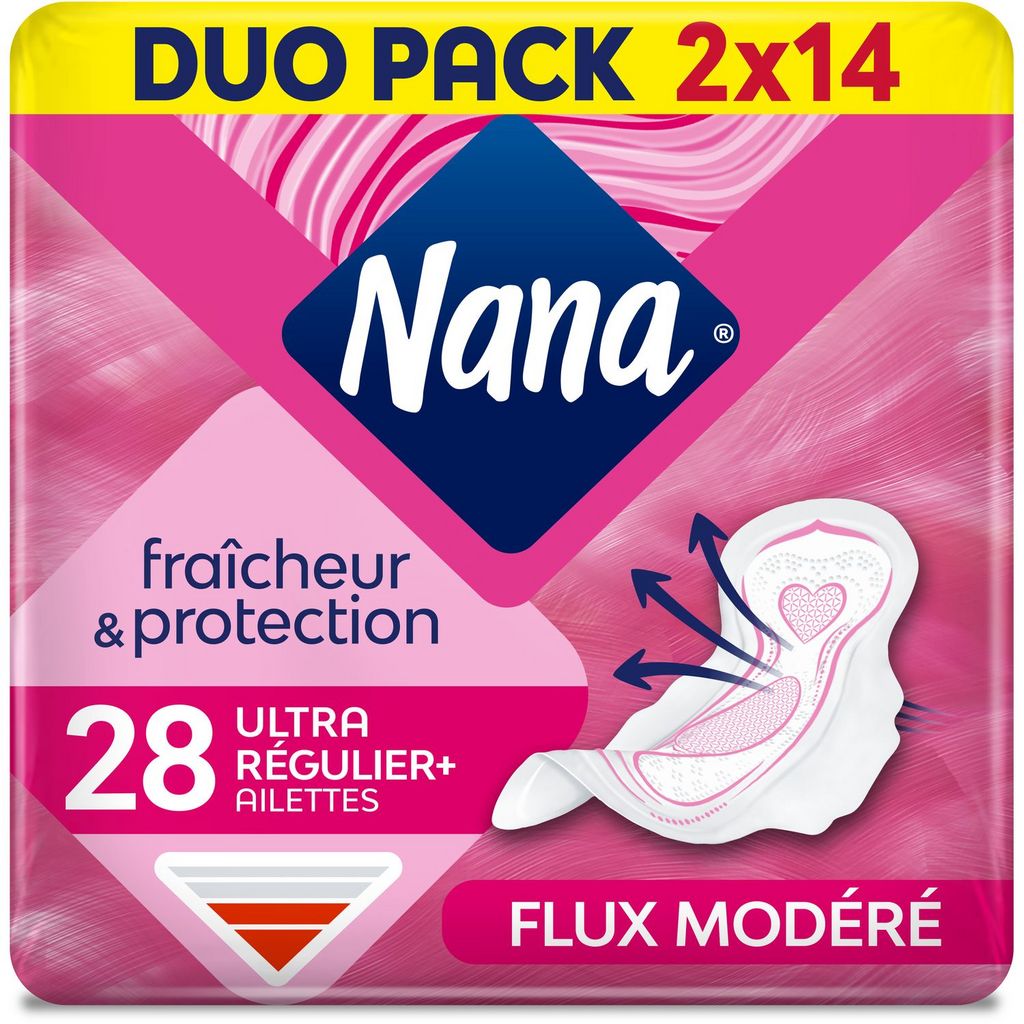 Serviettes Ultra Nana Normal Plus Duo Pack x28 Serviettes Hygièniques. Notre serviette SecurefitTM est conçue pour vous offir à la fois un confort optimal et une incroyable protection. Nous avons associé sa forme spécifique conçue pour épouser vos courbes à une triple protection intégrée pour que vous vous sentiez capable de tout ! Avec ailettes