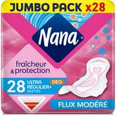 Serviettes hygiéniques Nana Ultra Normal Deo Fresh Jumbo Pack x28 Pour une plus grande sensation de fraîcheur, notre serviette est légèrement parfumée. Notre serviette SecurefitTM est conçue pour vous offrir à la fois un confort optimal et une incroyable protection. Nous avons associé sa forme spécifique conçue pour épouser vos courbes à une triple protection intégrée pour que vous vous sentiez capable de tout! - Forme différenciée à l'avant et à l'arrière pour épouser vos courbes - Barrières intégrales - Cœur conçu pour une absorption rapide - Murs anti-fuites