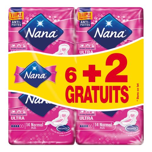 Serviettes Hygièniques. Notre serviette SecurefitTM est conçue pour vous offir à la fois un confort optimal et une incroyable protection. Nous avons associé sa forme spécifique conçue pour épouser vos courbes à une triple protection intégrée pour que vous vous sentiez capable de tout ! Avec ailettes Serviette Ultra Nana Normal Plus 6+2
