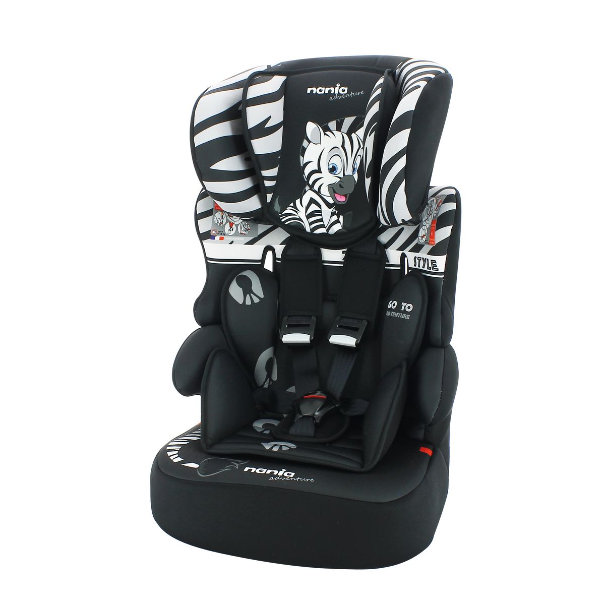 Votre bébé adorera voyager dans son siège auto groupe 1/2/3 Beline Zebra de Nania à l'effigie du petit zèbre. Confortable et sécuritaire, ce siège auto est utilisable de 9 à 36 kg. Le siège auto Beline Zebra est fabriqué et testé en France et répond aux homologations de la normes ECE R44/04 pour vous garantir une sécurité optimale. Le siège auto est fabriqué et testé en France. Le siège auto Beline Zebra est équipé d'un harnais 5 points avec double réglage à l'épaule utilisable de 9 à 18kg, puis le harnais peut se retirer à partir des 15kg et le siège devient un rehausseur avec dossier sans harnais jusque 36kg. Il évolue avec votre enfant grâce à la têtière réglable en plusieurs positions. Le siège auto Beline Zebra assurera une bonne protection en cas de choc latéral.