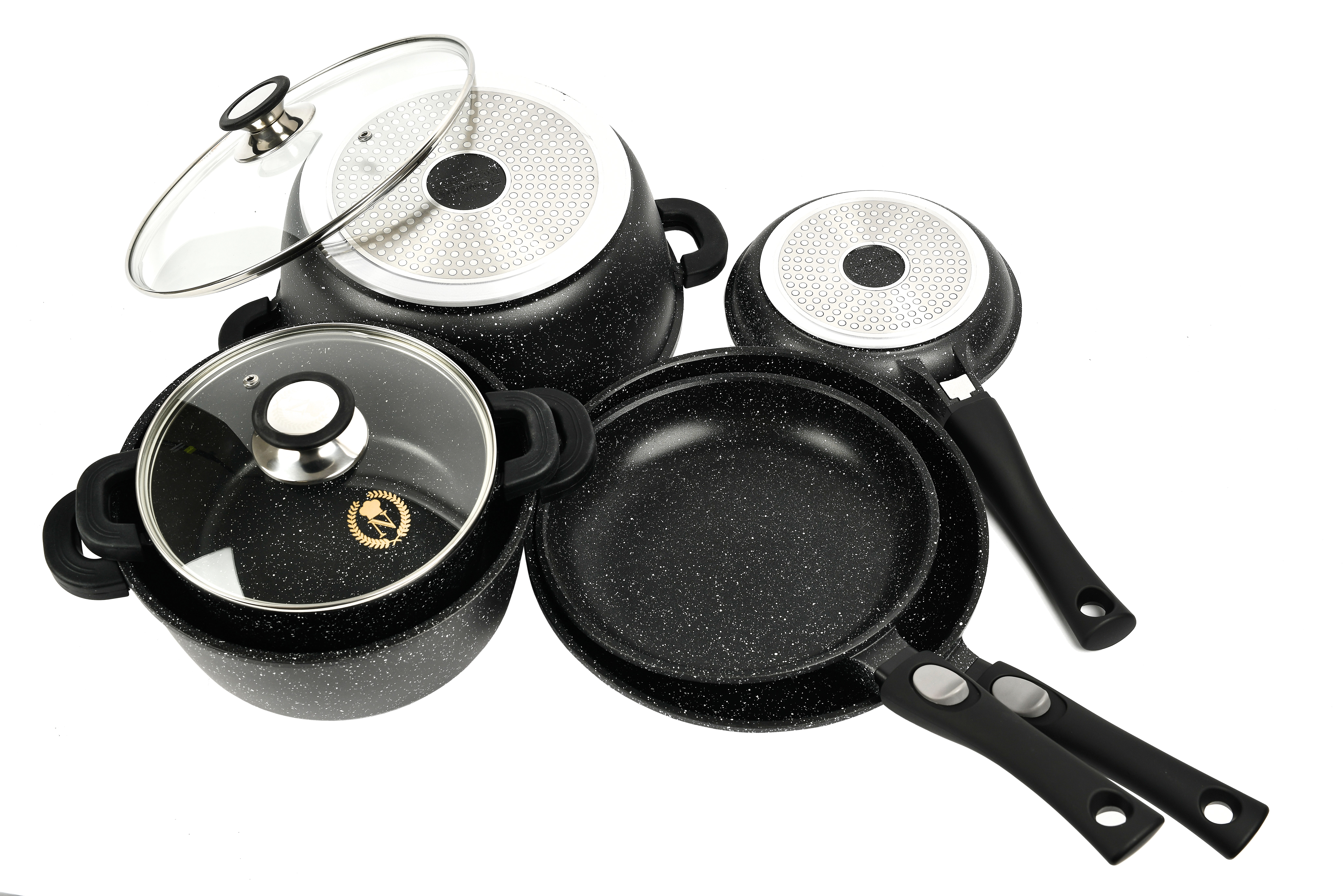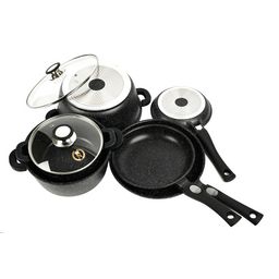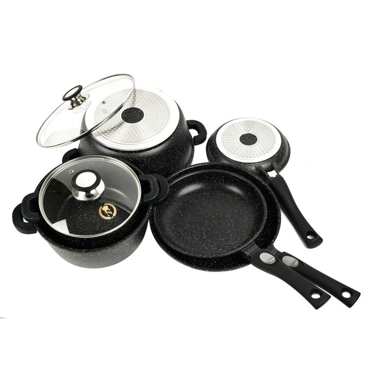 En savoir +Batterie de cuisine noire 18 pièces composée de 3 faitouts + 3 couvercles + 6 poignées silicones + 3 poêles + 3 poignées amovibles. Batterie tous feux dont induction en fonte d'aluminium effet pierre.
