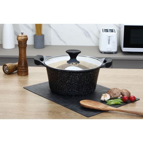 Découvrez le faitout 24cm effet pierre en fonte d'aluminium et sa poignée fixe en silicone soft touch ! Le faitout est ultra léger et solide. Faitout livré avec son couvercle. Revêtement antiadhésif. Compatible tous feux dont induction.