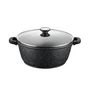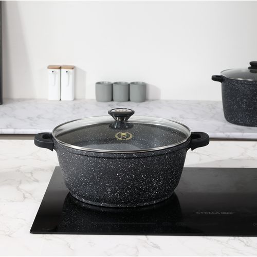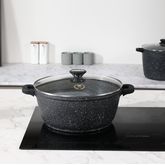 Faitout 36cm en fonte d'aluminium avec couvercle knob en inox et maniques silicones amovibles. Revêtement intérieur antiadhérent.