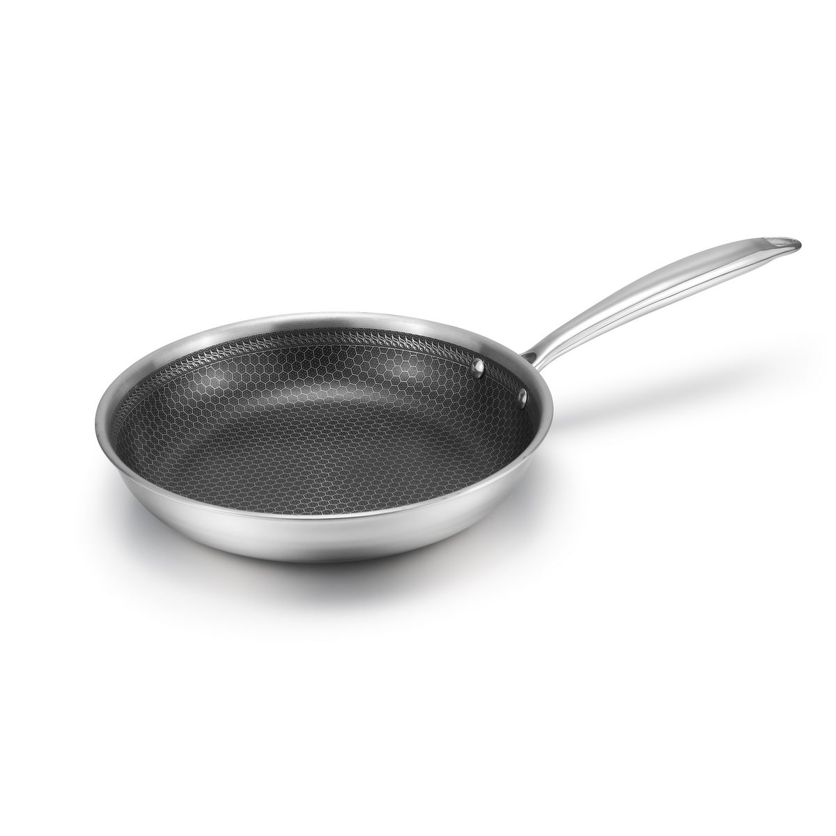 Poêle 24 cm en acier inoxydable avec revêtement antiadhésif nid d'abeille pour une cuisson sans accroche. Poignée fixe en acier inoxydable offrant une prise en main sûre et durable. Compatible lave-vaisselle pour un entretien facile et pratique. Idéale pour une cuisine performante et saine.
