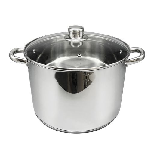 Traiteur 32 cm en acier inoxydable avec couvercle en verre, tous feux dont induction. Contenance 18L, poignées fixes en inox, sans revêtement antiadhésif. Compatible lave-vaisselle.