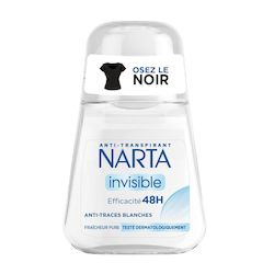 L’anti-transpirant Narta Invisible a été spécialement conçu pour celles et ceux qui osent porter du noir et souhaitent conserver un look impeccable en toutes circonstances. Sa formule assure une efficacité anti-transpirante pendant 48 heures, tout en restant totalement invisible sur la peau et les vêtements. Grâce à son action ciblée, il prévient efficacement l’apparition de traces blanches et jaunes, pour une protection optimale et discrète. Sa fraîcheur pure procure une sensation de netteté et de confort durable tout au long de la journée. Testé dermatologiquement, Narta Invisible respecte la peau et préserve le mécanisme naturel de transpiration. Chez Narta, nous savons que la confiance en soi est la clé qui permet d’ouvrir toutes les portes. Notre mission est de vous offrir le meilleur de l’efficacité déodorante en toute sécurité pour que jamais vous ne baissiez les bras. Depuis 1969, Narta vous accompagne dans vos défis du quotidien et vous assure une efficacité optimale, sans au