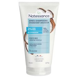 La gamme Hydratante de Natessance® sublime tous les types de cheveux. Cet après-shampooing allie l'huile de Coco bio, reconnue pour hydrater¹ et apporter souplesse aux cheveux, et la kératine végétale, contribuant à les fortifier et à les régénérer. Résultats prouvés : les cheveux sont hydratés pendant 48h², brillants et doux au toucher.