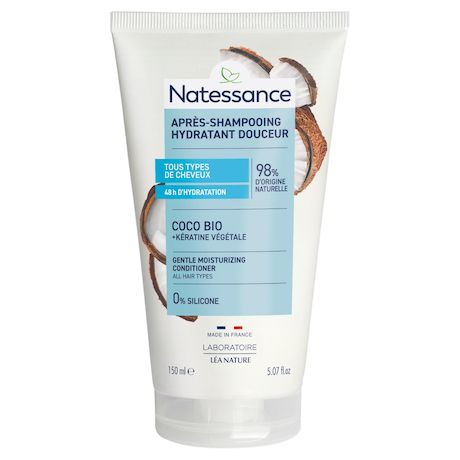 "Après-shampooing hydratant douceur Coco bio Kératine végétale Natessance huile de coco hydratant fortifiant kératine végétale après-shampooing démêlant douceur 0% sulfate 0% silicone Made in France Tous types de cheveux 98% origine naturelle