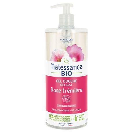 Natessance®, parce que l'essentiel est dans la nature. Enrichi en eau florale de rose trémière reconnue pour ses vertus apaisantes, ce gel douche apporte douceur à la peau, tout en l'enveloppant d'un voile floral exquis. "COSMOS ORGANIC certifié par ECOCERT Greenlife selon le référentiel COSMOS disponible sur http://cosmos.ecocert.com 96% du total est d'origine naturelle. 24% du total des ingrédients sont issus de l'agriculture biologique 0% sulfate, huile de palme*TESTÉ SOUS CONTRÔLE DERMATOLOGIQUESANS SAVON - SANS SULFATE2 - SANS HUILE DE PALME NI DERIVES FLACON en plastique VÉGÉTAL** *Bio-garanties du Laboratoire Léa Nature.**Hors pompe. 2 Sans Tensio-Actifs sulfatés"