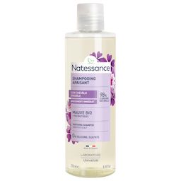La gamme Apaisante de Natessance® réduit les sensations d'irritations et de démangeaisons, procurant confort au cuir chevelu. Ce shampooing haute tolérance allie l'eau florale de Mauve bio, reconnue pour apaiser le cuir chevelu, et des postbiotiques d'origine naturelle, contribuant à améliorer l'état du cuir chevelu et le renouveler en douceur. Résultats prouvés : le cuir chevelu est moins sensible, apaisé immédiatement et pendant 48 h1. Les cheveux sont hydratés, plus doux et brillants.