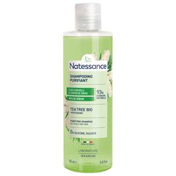 "La gamme Purifiante de Natessance® élimine l'excès de sébum et apporte fraîcheur au cuir chevelu et aux cheveux gras. Ce shampooing allie l'huile essentielle de Tea Tree bio, reconnue pour pour purifier et apporter légèreté aux cheveux, et le Phycozinc, agent sébo-régulateur contribuant à rétablir l'équilibre du cuir chevelu. Résultats prouvés : le cuir chevelu est assaini et rééquilibré, le sébum est réduit de -78%"