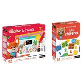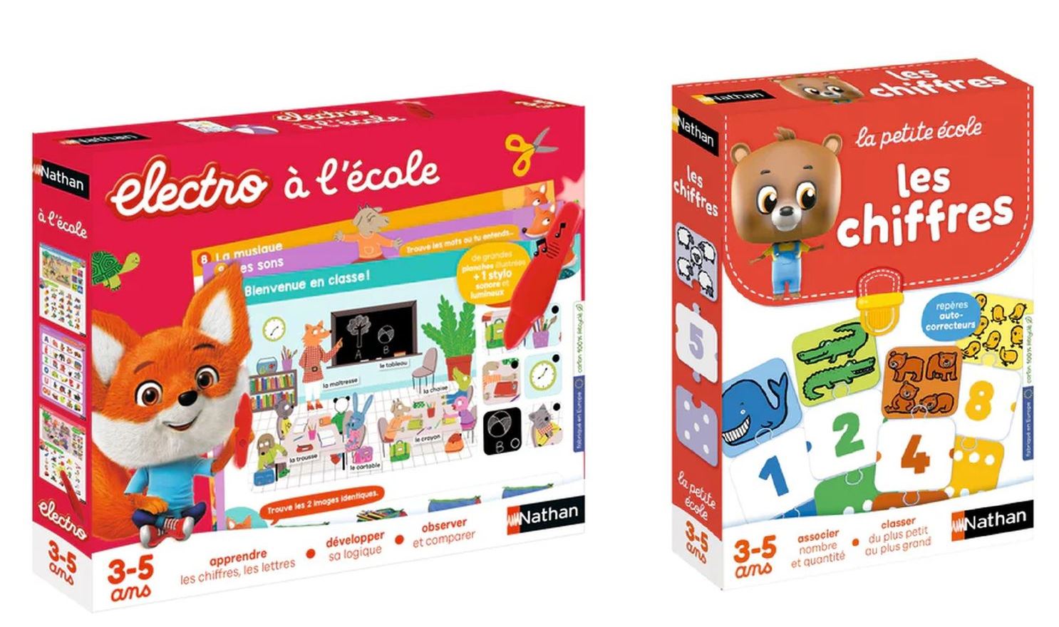 Un jeu électronique de questions-réponses pour faire ses premiers apprentissages. Observation, logique, couleurs, formes, chiffres… Pour chaque question, l’enfant pointe son stylo sur la bonne réponse. Si le stylo s’allume, bravo, la réponse est bonne ! Thèmes : la classe, les arts plastiques, la récré, le coin lecture, la cantine, la sieste, la gym, la musique…Un jeu d’association pour apprendre les chiffres de 1 à 10. L’enfant associe l’image (« deux crocodiles ») avec le chiffre (« Deux ») et les points correspondants (« deux points »). C’est simple et les trois cartes sont de la même couleur! Il peut également les classer du plus petit au plus grand.