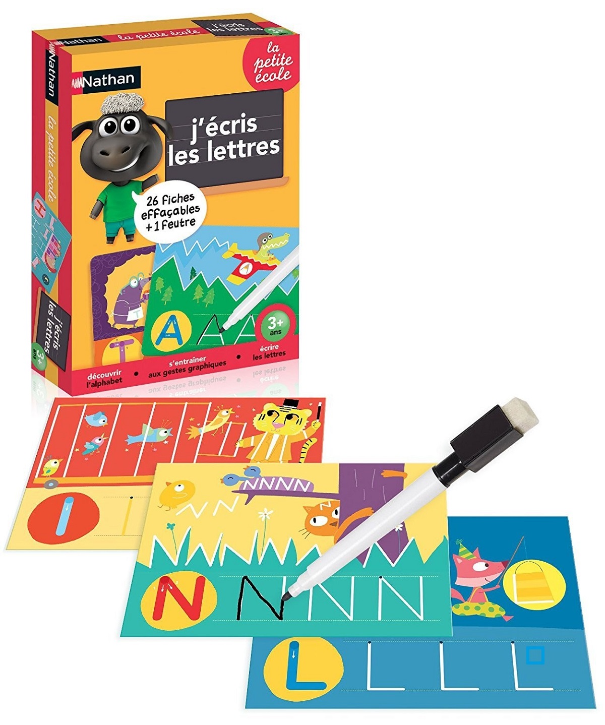 J'écris les lettres de Nathan est un premier jeu pour faire ses premiers pas vers l'écriture avec un apprentissage progressif. L'enfant intègre les gestes préparatoires à l'écriture avec les graphismes et écrit ses premières lettres sur les 13 planches effaçables et utilisables à l'infini. Au tota