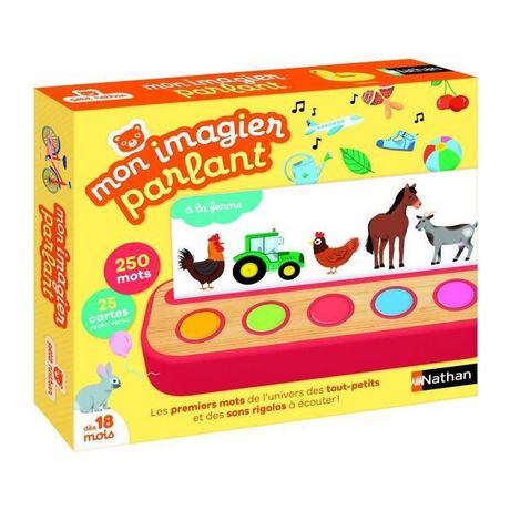 Grâce a ce jeu interactif, le bébé découvre plus de 250 mots autour de 50 themes tels que les objets du quotidien, les animaux ou les instruments de musique. L'enfant appuie sur les boutons et le mot est lu. Entre 1 et 2 ans, le bébé entre dans une phase << d'explosion du langage >>