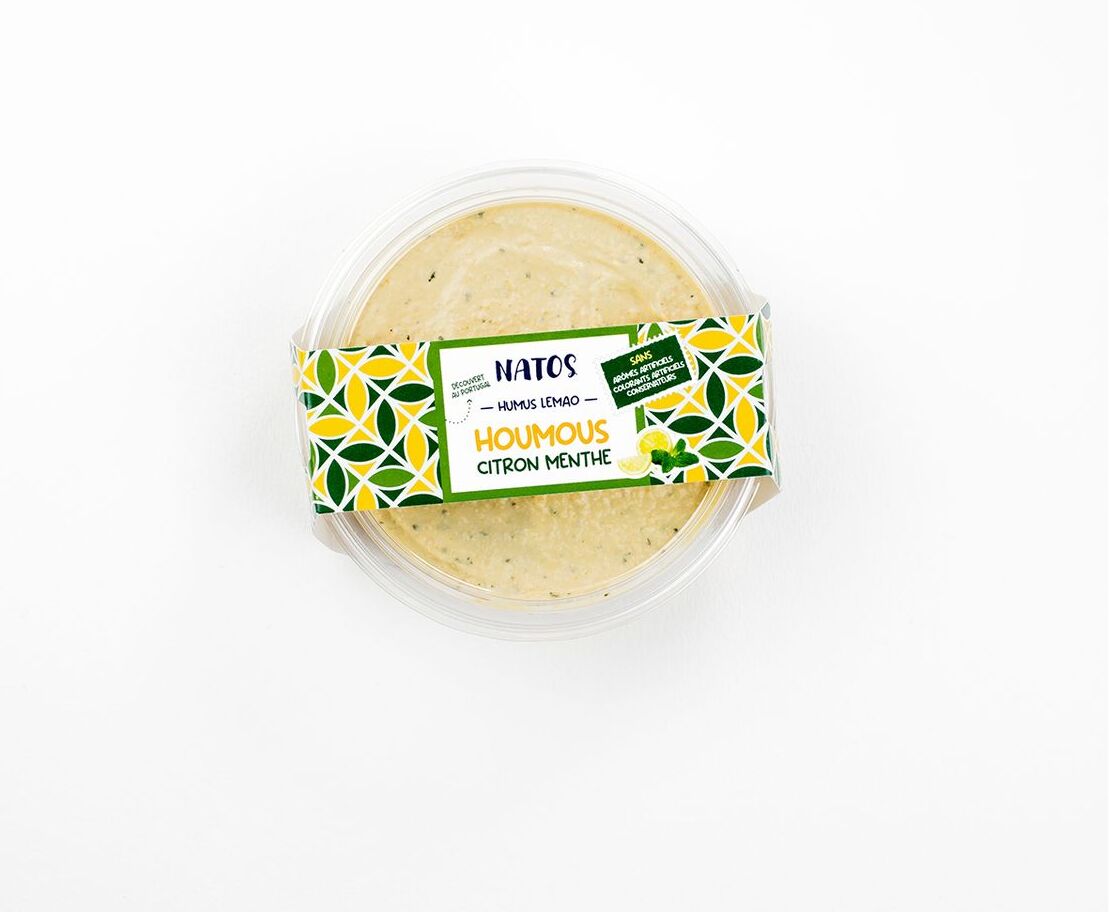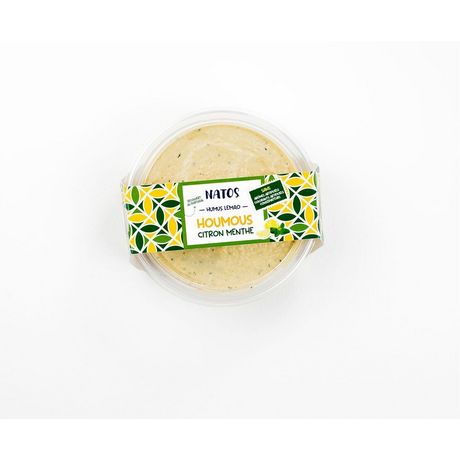 Ingrédients : "Pois chiche 54%, huile de colza, pâte de graines de sésame 11%, eau, écorce de citron confit 3,4% (écorce de citron, sirop de glucose-fructose, sucre, correcteur d'acidité : acide citrique), jus de citron concentré, huile d'olive vierge extra, menthe 0,99%, sel.