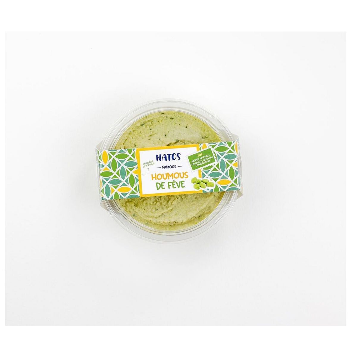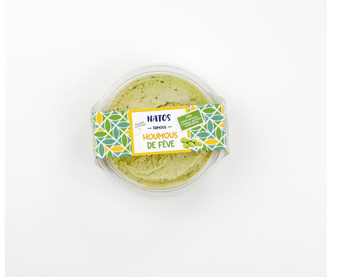 Ingrédients : "Fèves 49%, pois chiche 16%, eau, huile de colza, pâte de graines de sésame 3,7%, huile d'olive vierge extra, coriandre, sel,coriandre en poudre, ail,jus de citron concentré, cumin.