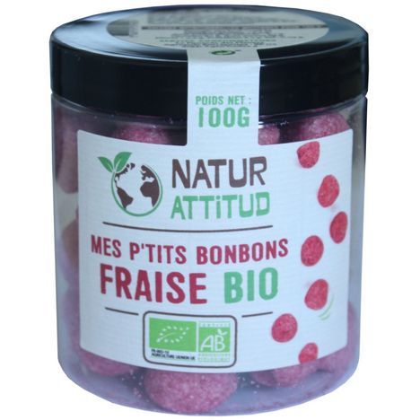 MES P'TITS BONBONS BIO FRAISE Ce bonbon fondant est un délice qui plaira à tous. Confiserie aromatisée colorée avec des concentrés végétaux en forme de dôme