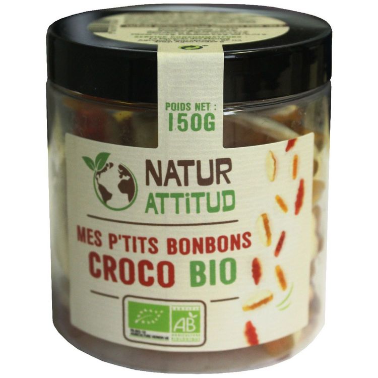 MES P'TITS BONBONS CROCO BIO POT 150G Confiserie aromatisée colorée avec des concentrés végétaux en forme de crocodiles.
