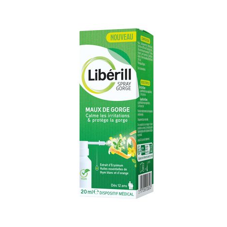 Libérill spray gorge à l'extrait d'erysimum et aux huiles essentielles de thym blanc et d'orange qui calme les irritations, protège et réhydrate.