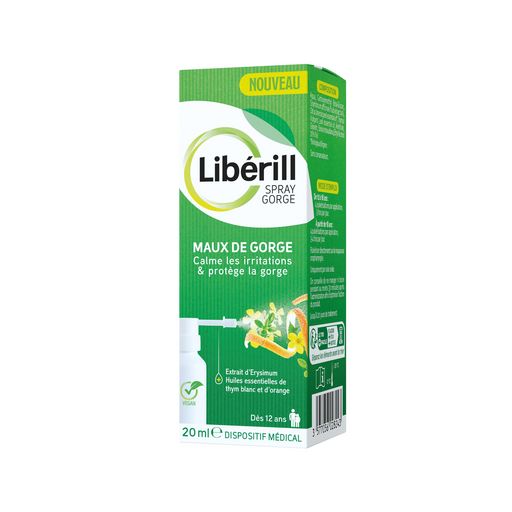 Libérill spray gorge agit comme un adjuvant dans le traitement de la pharyngite aiguë dès ses premiers symptômes, de la déglutition douloureuse, de l'irritation ou sécheresse de la bouche, provoquée par des agents externes (virus ou bactéries) et des facteurs environnementaux (fumée passive, variations brusques d'humidité et de température). Il procure une agréable sensation de fraîcheur grâce à sa délicate composition aromatique. Du fait de sa remarquable action mucoadhésive, il apporte un soulagement en cas d'irritation de la muqueuse oropharyngée. Les polysaccharides présents dans Libérill Spray Gorge créent une couche protectrice résistante qui lutte contre l'action irritante des agents physiques externes et la pénétration de microorganismes pathogènes. Il favorise également avec efficacité l'hydratation de la muqueuse, en facilitant le rétablissement physiologique des tissus, en réduisant indirectement l'irritation et la sensation de douleur.