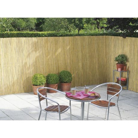Claie en roseau naturel ouvert. Idéal pour créer l&rsquo,intimité nécessaire dans votre jardin, terrasse ou balcon d&rsquo,une manière naturelle et très décorative. Roseau naturel ouvert, assemblé avec du fil de fer. Utilisable aussi pour la décoration à l&rsquo,intérieur. Dimensions: 1 x 5 mètres