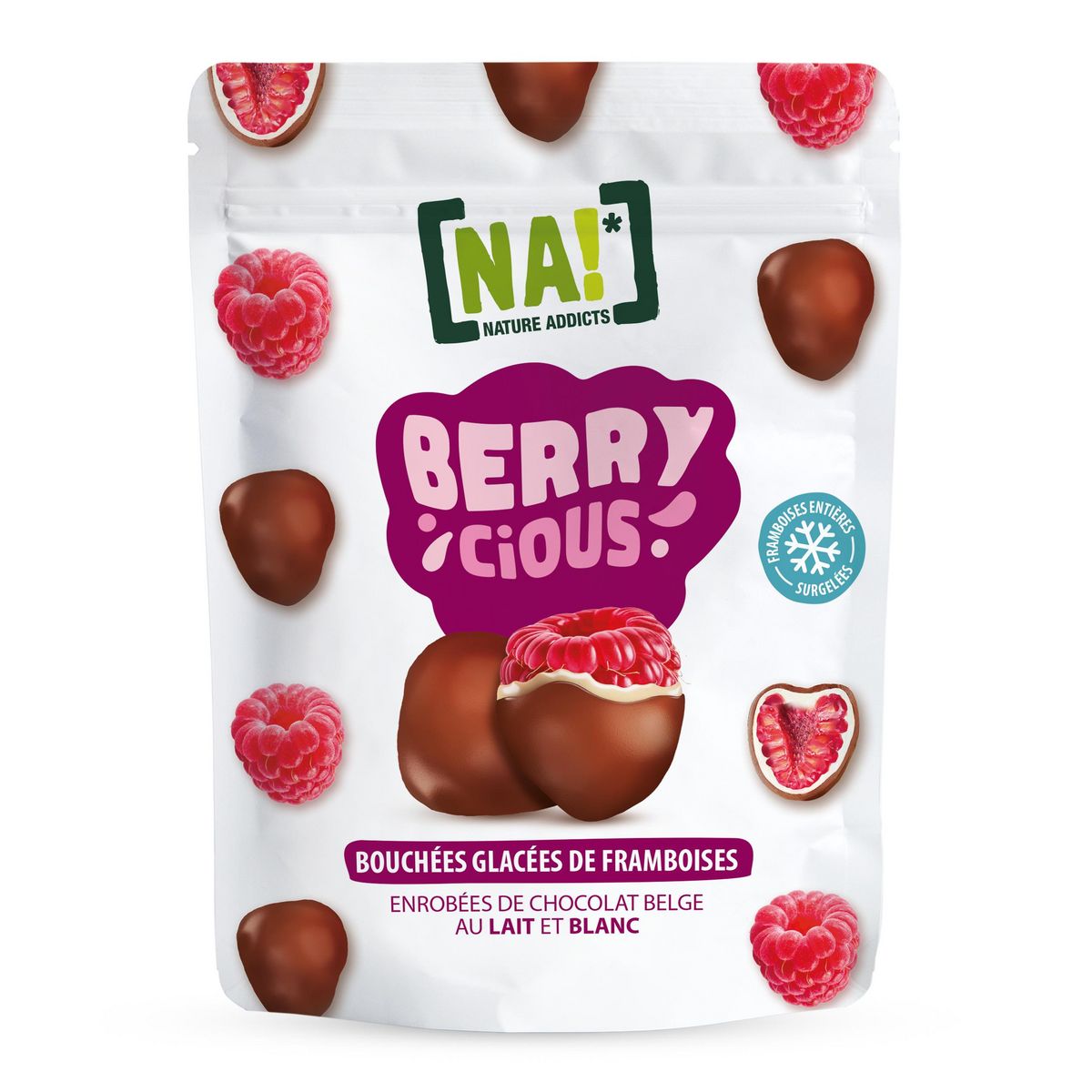 De délicieuses framboises surgelées enrobées de deux couches de chocolat belge ( chocolat blanc et chocolat au lait) pour un max de plaisir