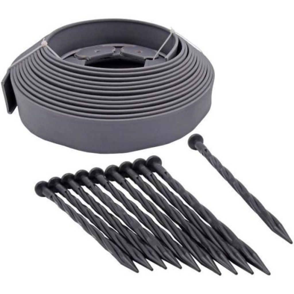 Nature - Bordure a gazon grise en rouleau - PE épaisseur 4 mm - H5 cm x 10 m fournie avec 10x clous torsadés noir - H20cm x 8 mm - Résistante aux chocs, UV, et variations de température, la bordure s'utilise pour des réalisations droites, courbes ou circulaires (diametre minimum 18 cm). Elle se pose
