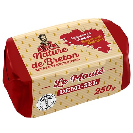 Le beurre demi-sel Nature de Breton est fabriqué à Quimper exclusivement à partir de crèmes de Bretagne et dans le respect du savoir-faire traditionnel. Son goût savoureux a été récompensé de la Médaille d'Or du Concours Agricole en 2024, ce qui en fait un beurre parfait pour la tartine, en pâtisserie et en cuisine.