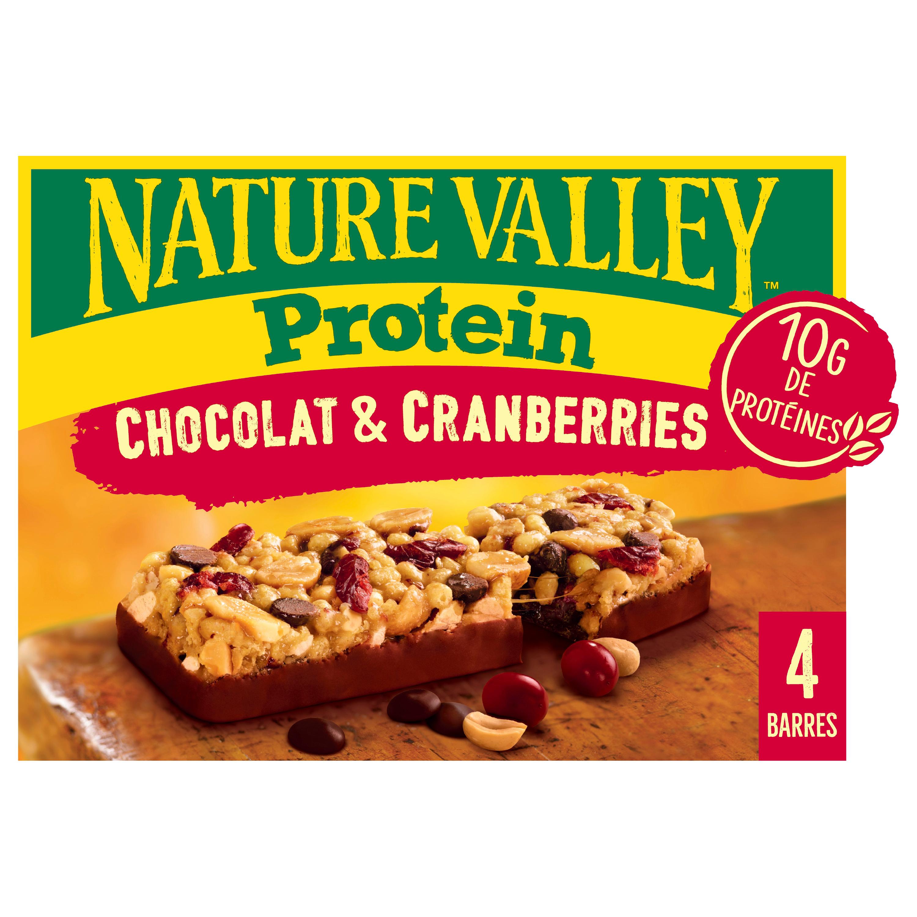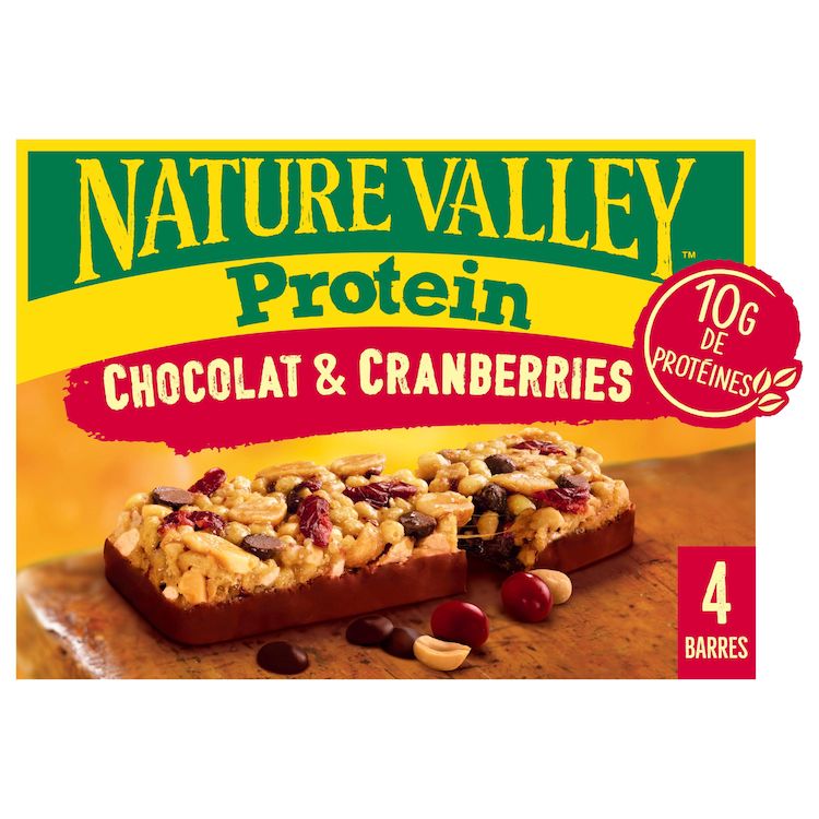 Laissez-vous tenter par le plaisir des barres de céréales Nature Valley™ Protein. Profitez de la gourmandise de nos barres aux au chocolat et cranberries et emportez les partout grâce à nos sachets individuels. Ces barres de céréales sont riches en fibres, sans colorant, sans conservateur, sans arôme artificiel et sans gluten.