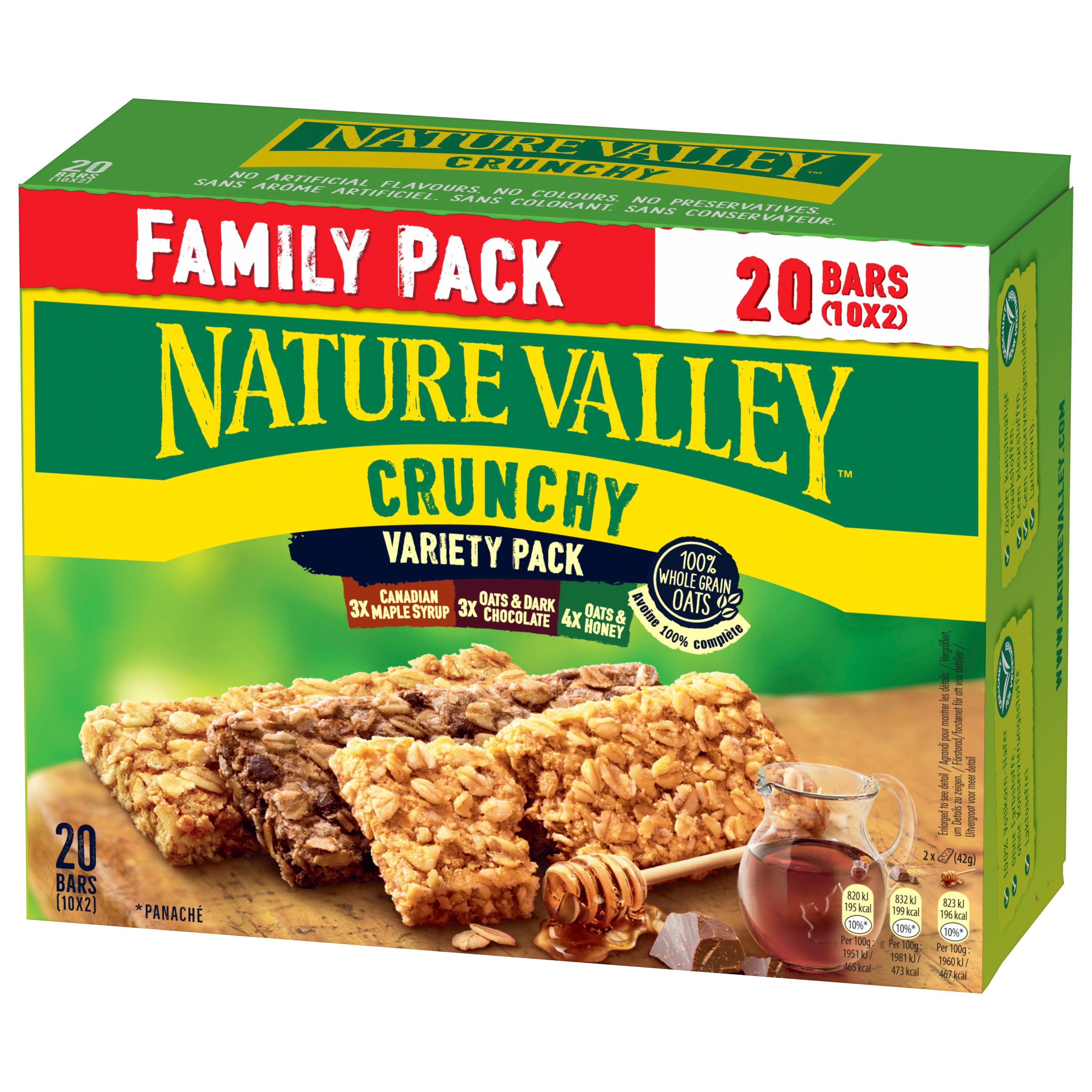 Laissez-vous tenter par le plaisir des barres de céréales Nature Valley™ Crunchy. Profitez de la gourmandise et du croquant de nos barres à l'avoine 100% complète et retrouvez dans chaque sachet individuel, deux barres de céréales à emporter partout. Ces barres de céréales sont sans colorant, sans conservateur, sans arôme artificiel, sans lactose.