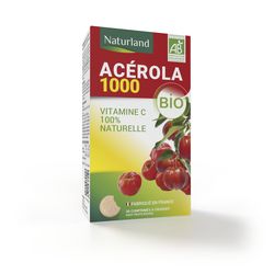 L’Acérola est une petite baie des Caraïbes et d’Amazonie, connue pour sa forte teneur en vitamine C. La vitamine C aide à réduire la fatigue et contribue également au bon fonctionnement du système immunitaire. ACEROLA 1000 BIO NATURLAND apporte 173 mg de vitamine C 100 % naturelle par comprimé pour vous aider à maintenir tonus et vitalité.