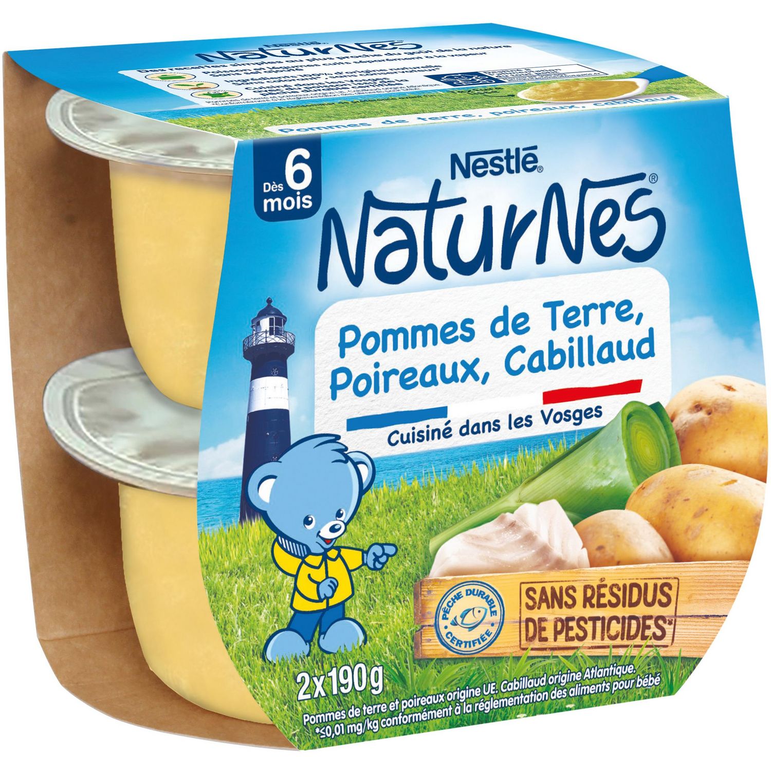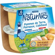 NOUVEAU ! NaturNes® contribue à prendre soin de la nature pour en offrir le meilleur à bébé. Rigoureusement sélectionnés, tous nos ingrédients sont 100% d'origine naturelle, nos légumes sont sélectionnés à maturité et nos poissons sont issus de pêche durable certifiée. Nous préservons par ailleurs les goûts grâce à un mode de cuisson à la vapeur douce. Ainsi, pour la diversification alimentaire de bébé, faites-lui découvrir nos petits pots dès 6 mois, pomme de terre, poireaux, cabillaud, élaborés en France dans les Vosges ! Pommes de terre et poireaux origine UE. Cabillaud origine Atlantique.