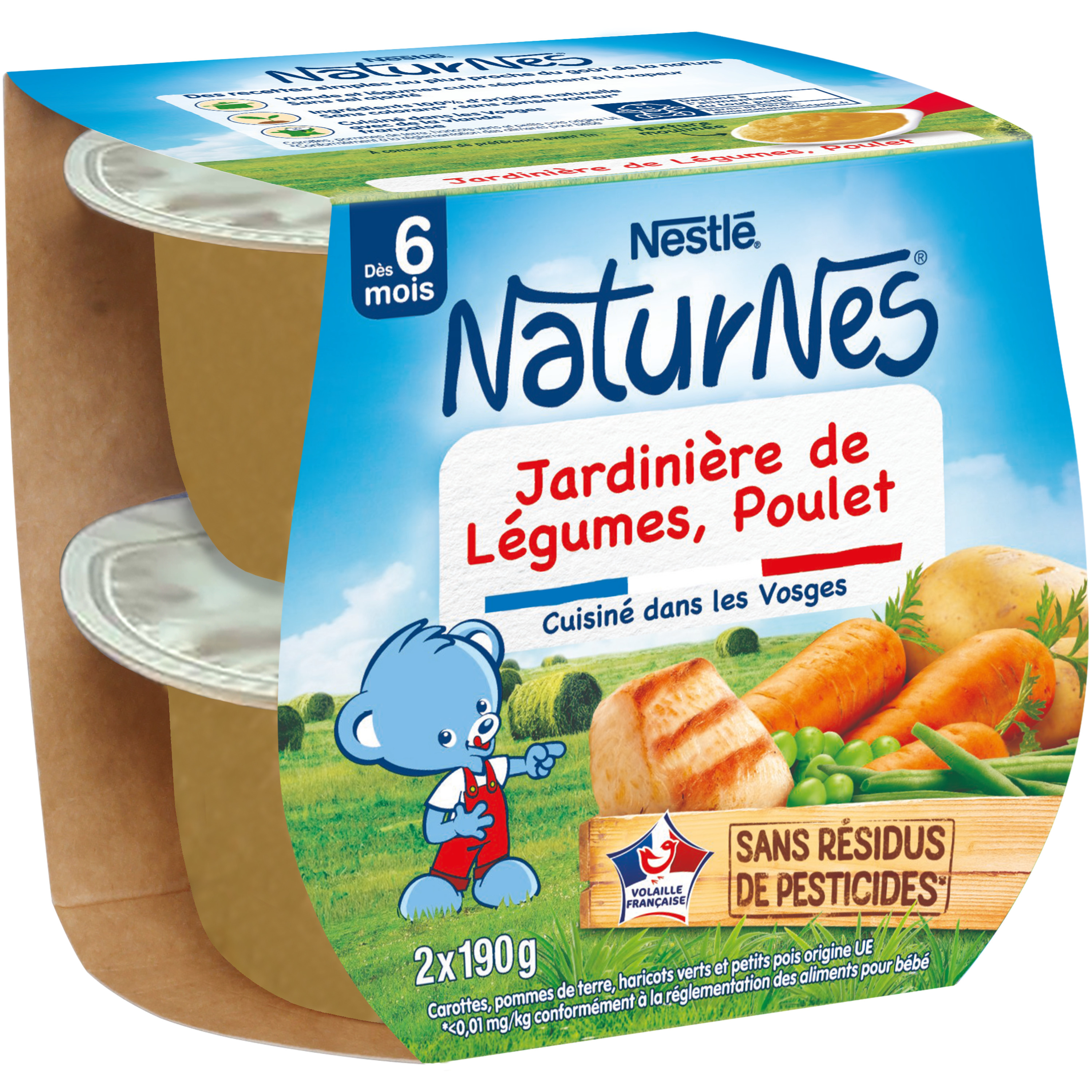 NATURNES contribue à prendre soin de la nature pour en offrir le meilleur à bébé. Rigoureusement sélectionnés, tous nos ingrédients sont 100% d'origine naturelle, nos légumes sont sélectionnés à maturité et nos viandes sont 100% françaises. Nous préservons par ailleurs les goûts grâce à un mode de cuisson à la vapeur douce. Ainsi, pour la diversification alimentaire de bébé, faites lui découvrir nos petits pots pour bébé aux légumes et poulet élaborés en France dans les Vosges, avec des ingrédients 100% d'origine naturelle !