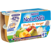 Ingrédients: Pommes 50%, poires 37,5%, pêches 7,5%, abricots 4,9%, vitamine C.