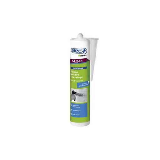 Mastic Silicone sanitaire SL241 NEC+ transparent 310ml x 5 Nec + SILest un mastic élastomère silicone à bas module, qui polymérise au contact de l'air pour former rapidement un joint d'étanchéité souple et résistant. Application d'étanchéité et de collage sur céramique, faïence, porcelaine et autres surfaces vitrifiées dans les applications nécessitant une protection contre le développement des moisissures : salles de bains, lavabos, douches, cuisines, éviers, tôle émaillée, plan de travail, joints de carrelage.