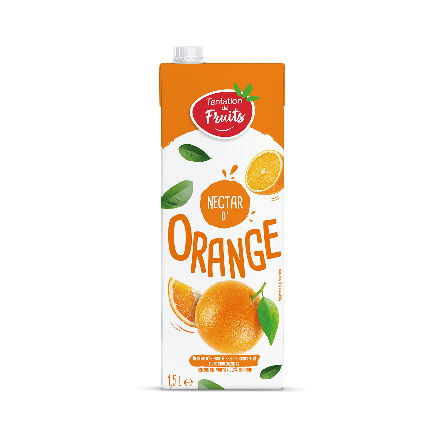 Nectar d'Orange à base de concentré avec édulcorants. Teneur en fruits : 50% minimum