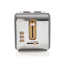 Nedis KABT510EGY Grâce à ses fentes extra-larges, ce grille-pain grille de Nedis KABT510EGY parfaitement le pain prétranché, le pain coupé à la main, les bagels ou les muffins. Les six modes différents et les boutons d'annulation, de réchauffage et de décongélation vous permettent d'avoir un contrôle parfait. Avec son tiroir à miettes amovible, cet élégant grille-pain est simple à entretenir et toujours impeccable. Combinant l'acier inoxydable avec la finition du bois et du caoutchouc, cet appareil électroménager est aussi beau que fonctionnel. Deux fentes extra-larges pour griller toutes sortes de pains. Six modes différents pour préparer vos toasts exactement comme vous le souhaitez. Fonctions réchauffage, dégivrage et annulation. Tiroir ramasse-miettes coulissant pour faciliter le nettoyage.