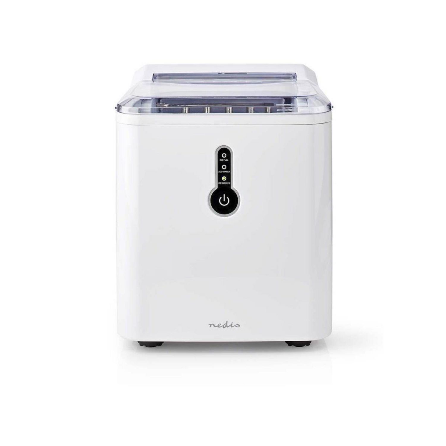 Nedis KAIC100FWT Cette machine à glaçons KAIC100FWT de Nedis reste compacte même avec son réservoir d'eau de 1,6 L qui produit des glaçons pour toutes vos boissons fraîches, n'importe où et n'importe quand. En seulement 8 minutes, vos glaçons sont prêts. La machine peut produire jusqu'à 12 kg de glace en 24 heures. La machine à glaçons est dotée d'un voyant qui indique si le bac à glaçons est plein, mais aussi si vous avez besoin de rajouter de l'eau. Cette machine à glaçons est très facile d'utilisation : versez de l'eau dans le réservoir, puis allumez la machine à glaçons. Une fois mise en route, la machine pompe automatiquement l'eau vers le collecteur d'eau. Ensuite, le refroidissement commence. Après environ 7 minutes, les 9 premiers cubes prennent forme sur les pointes qui se trouvent au-dessus du bac collecteur. Une courte phase de dégel permet ensuite aux glaçons de tomber. Le plateau basculant ramène alors l'eau restante dans le réservoir et pousse les glaçons dans le bac collecteur.