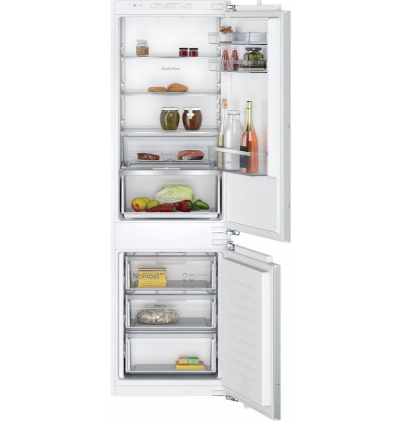 Neff KI7867FE0 Ce réfrigérateur combiné encastrable No Frost N50 Neff KI7867FE0 avec compartiment Fresh Safe 1 garde les aliments au frais. Fresh Safe - Permet à vos fruits et légumes de rester croquants et frais NoFrost : Fini le dégivrage manuel. Le système de ventilation assèche l'air et empêche la formation de givre. Eco Air Flow - Température constante à tous les niveaux Super-congélation: grâce à cette fonction, la température est temporairement plus basse - idéal quand vous posez de nouveaux aliments dans le congélateur. Eclairage LED : éclairage agréable dans le réfrigérateur grâce aux LED à longue durée de vie.